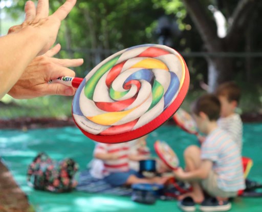 Our families love Music Together® Outside! This beloved mixed-age parent/caregiver + child class setting is one that a child can attend all the way from birth to Kindergarten, rotating through all 12 of our beautifully published song collections including summers. This highly engaging class follows the recommendations of child development researchers – that grouping children of a variety of ages fosters natural, family-style learning. Younger children enjoy watching and imitating older ones; older children learn by leading younger ones; and adults are happy because all the young children in their family can go to class together and richly benefit from the experience. Each child participates at their own level, together with their grown-ups, singing, moving, chanting, listening, watching, or exploring musical instruments.
